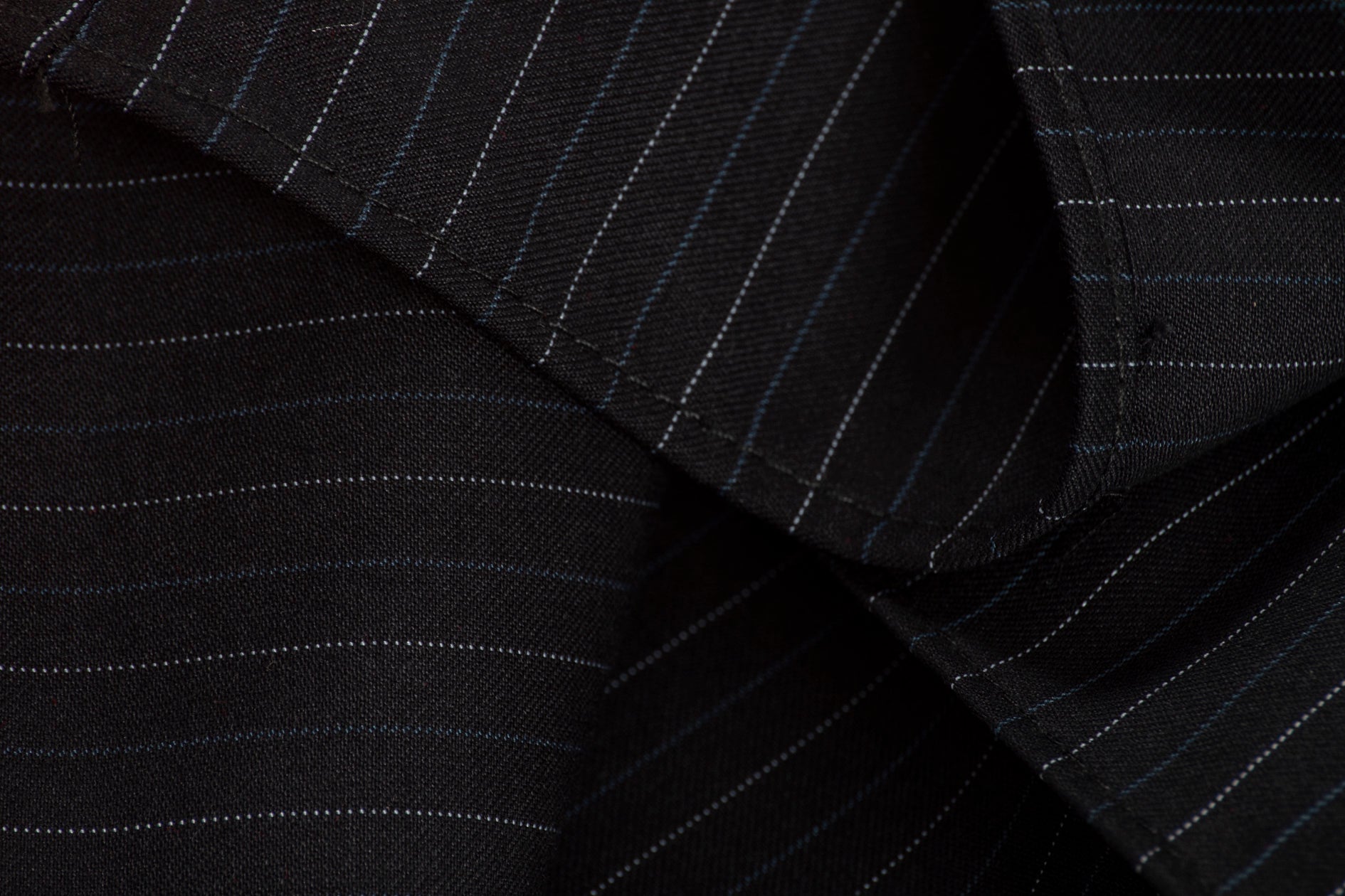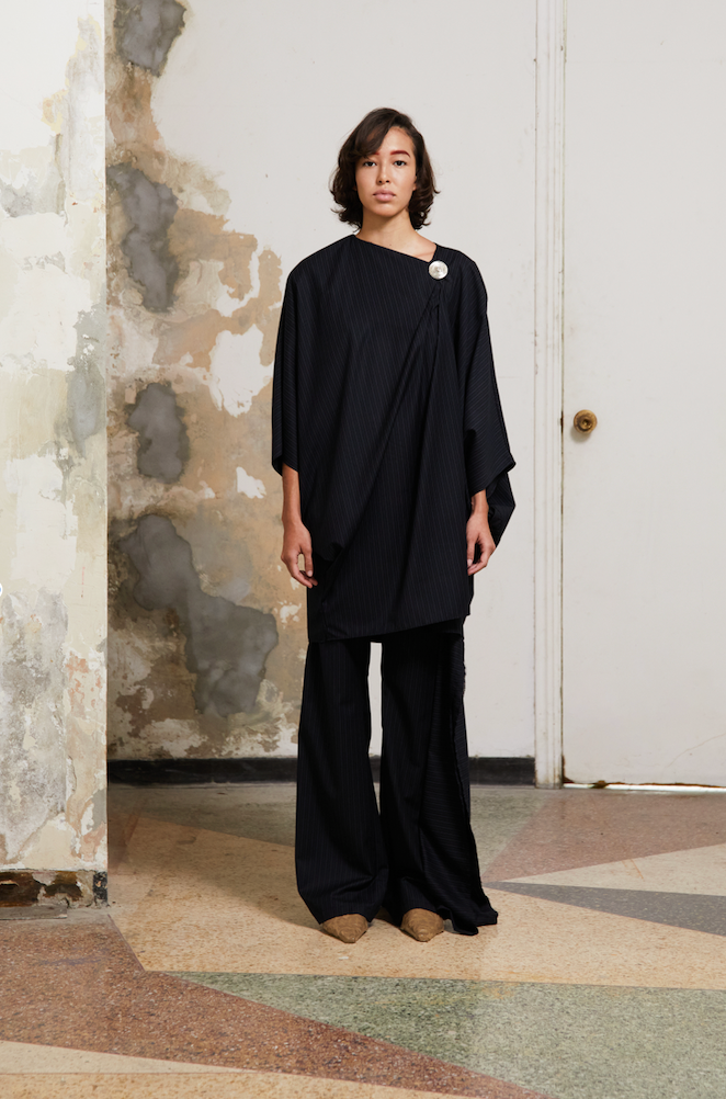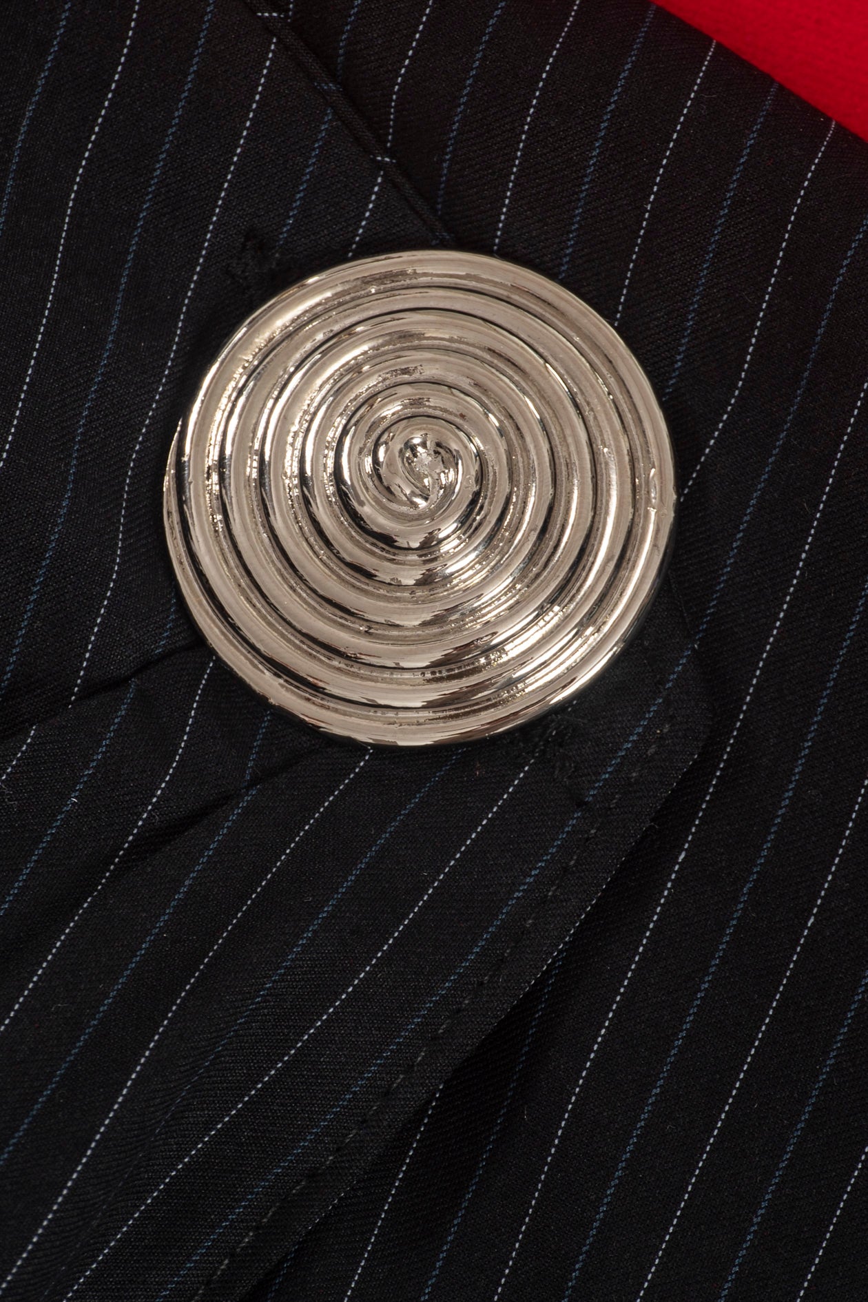 Made from navy wool, this asymmetrical vest boasts side pockets and a striking metallic spiral button closure.