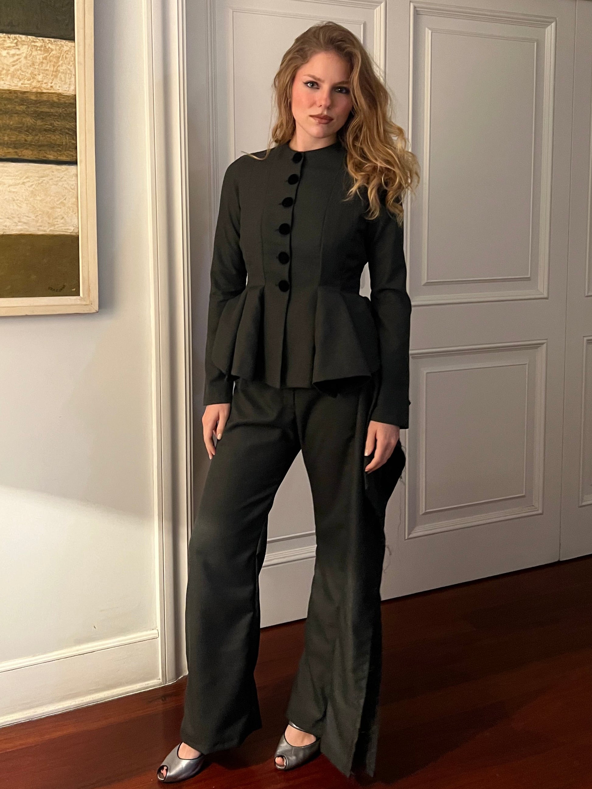 The Manuela Top is a perfectly tailored piece, inspired by 1950's tailoring and featuring 16 unique paneled pieces that open at the waist to define the silhouette. With velvet covered buttons and a fully lined design craftsmanship.