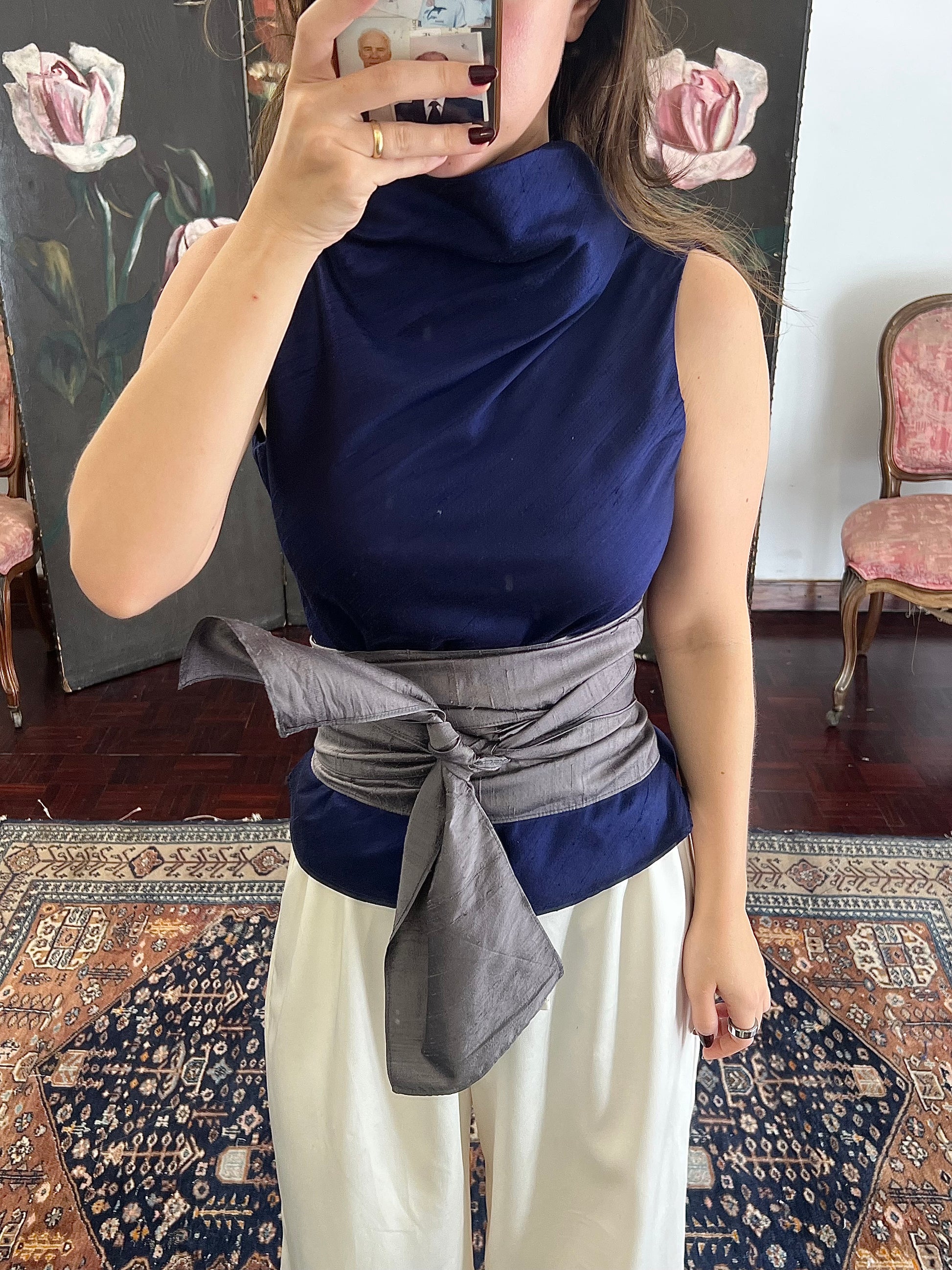 High Neck Blouse, with long straps for bow tie and multi wrapping ways, can be worn front or back, button closure at the back.