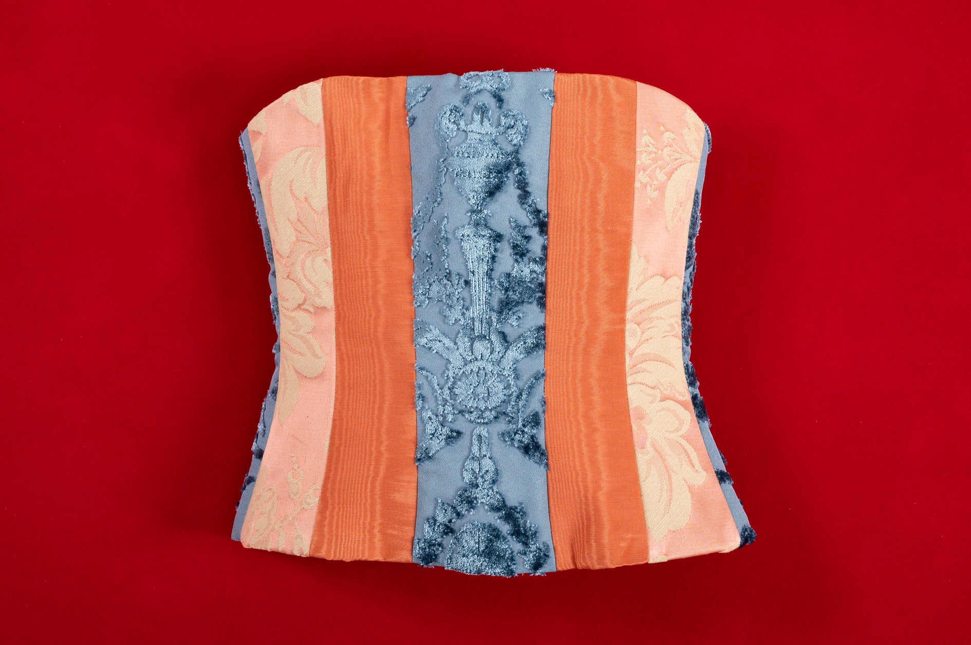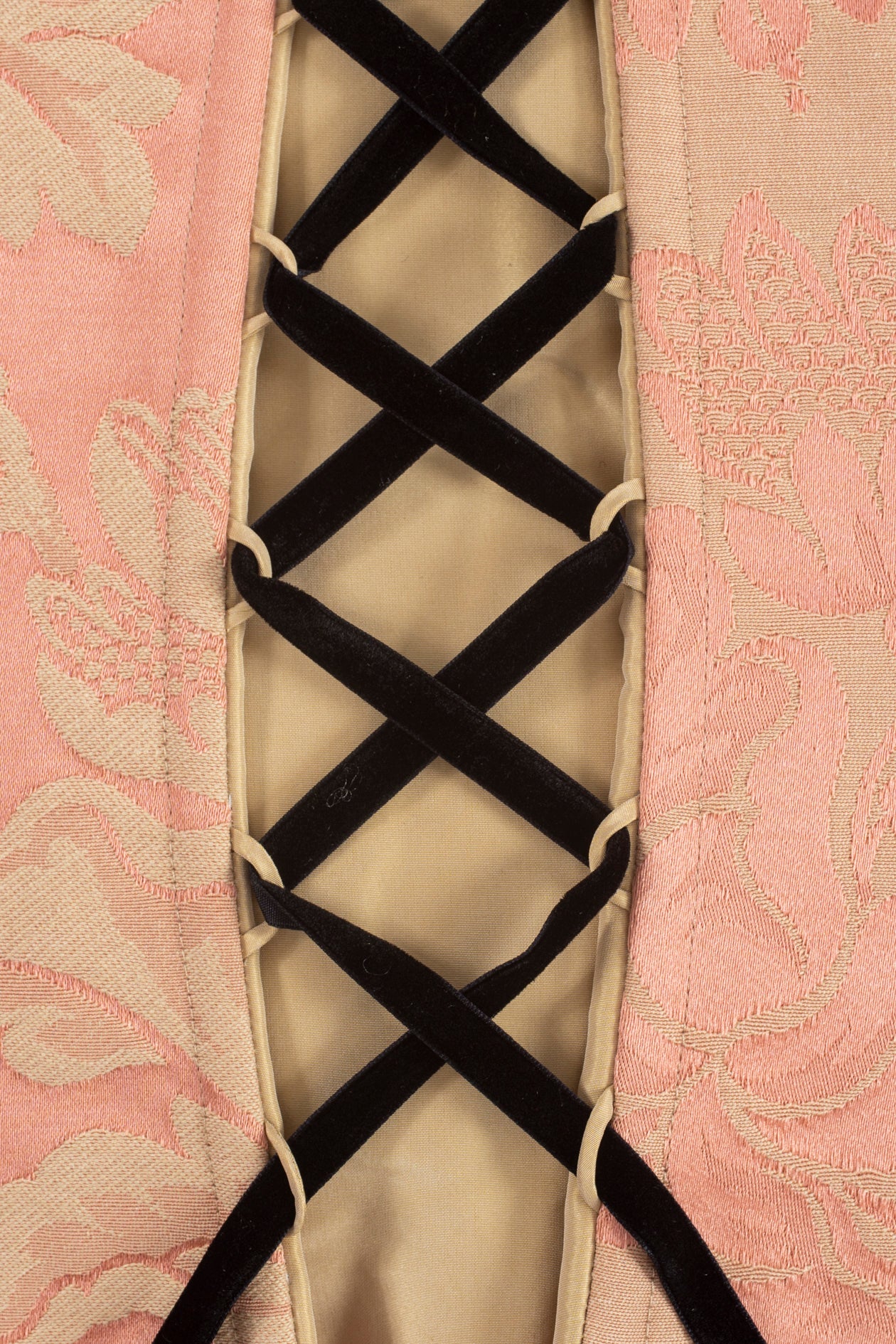 Structured adjustable corset top. Paneled cuts through the front & back, adjustable lacing in the back.