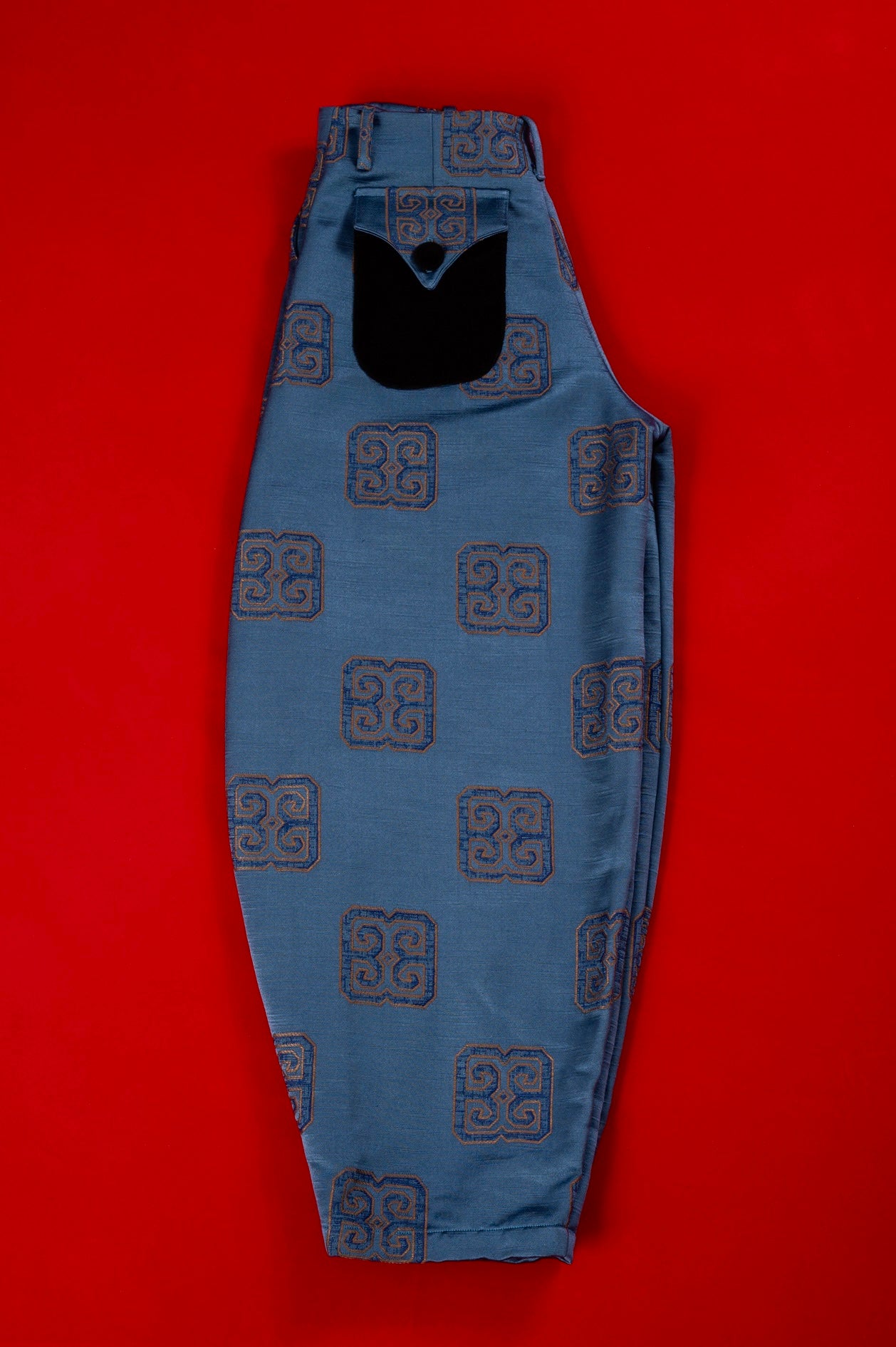 A horseshoe shaped trouser, mid waist cut, with a singular pocket detail at the back. Relaxed fit.